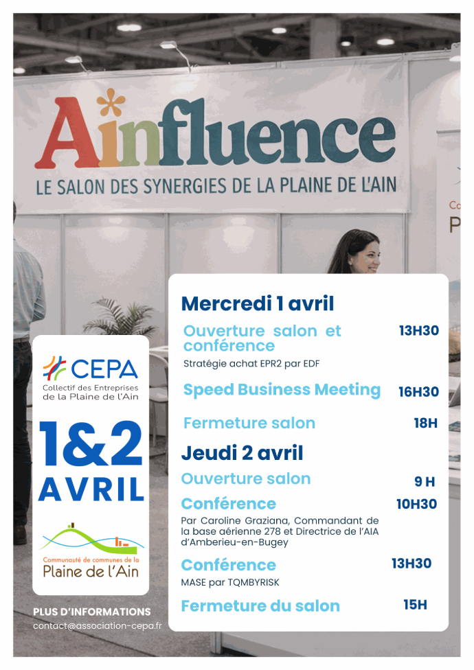 Le salon Ainfluence vous donne rendez-vous les 1er et 2 avril à la salle polyvalente de Lagnieu pour découvrir les entreprises de la Plaine de l’Ain, assister aux conférences et développer votre réseau.